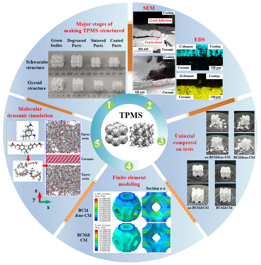 陶瓷器件具有很高的强度,但其固有的脆性限制了其在撞击时抵抗断裂的能力。陶瓷材料可以通过优化结构来实现陶瓷增韧,但这往往会严重影响陶瓷材料的强度。为了解决陶瓷材料增韧和强度这一矛盾问题,本文从仿生学角度,提出了一种采用3d打印技术通过内外强化和增韧原理制备抗损伤陶瓷材料的方法。在本方法中,先对氧化铝陶瓷生坯采用埋烧法进行脱脂处理,然后在烧结陶瓷零件后使用了涂层法进行增韧。实验结果表明,通过采用埋烧法和涂层法进行处理的陶瓷器件,与未处理的陶瓷器件相比,极限压应力增加了259%,能量吸收(韧性)增加161%。另外,该论文还采用有限元法和分子动力学模拟法从宏观和微观角度研究了陶瓷材料的增韧和强化机理。