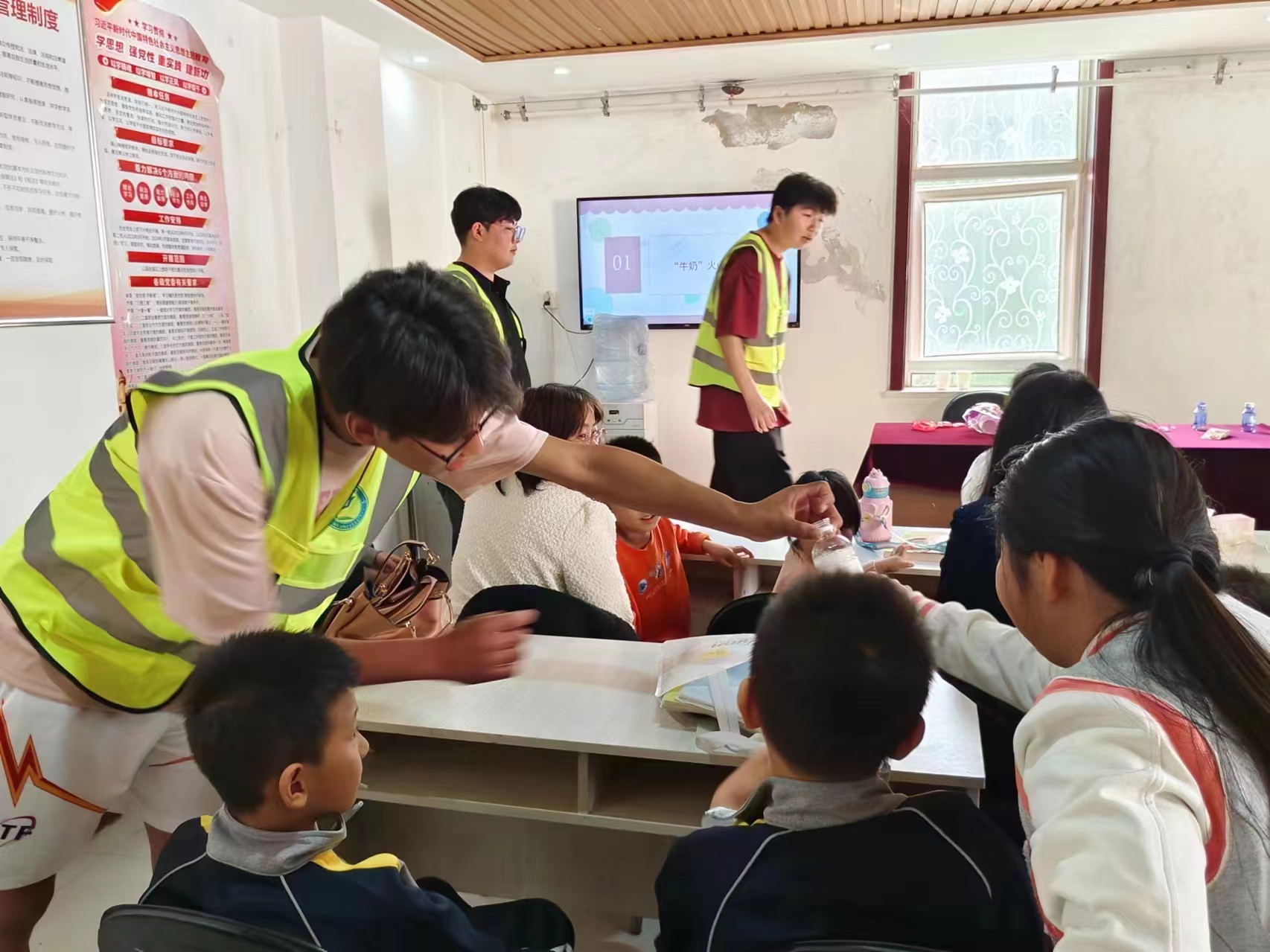紧接着,“牛奶火山爆发”实验更是将现场气氛推向了高潮。志愿者们将牛奶、色素、洗洁精和白醋等材料混合在一起,随着白醋的倒入,盘中的牛奶瞬间像火山爆发般喷涌而出,形成了壮观的彩色泡沫。孩子们被这一奇特的现象深深吸引,纷纷围上前来仔细观察。志愿者们趁机向孩子们解释了酸碱反应的原理,让他们感受到了科学的神奇和乐趣。