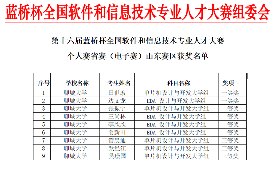 近日,第十六届蓝桥杯全国软件和信息技术专业人才大赛个人赛省赛(电子赛)山东赛区获奖名单公布。我院学子在此次比赛中表现优异,共取得一等奖2项、二等奖4项、三等奖3项的优异成绩,这是我院首次参加此比赛,实现“开门红”。