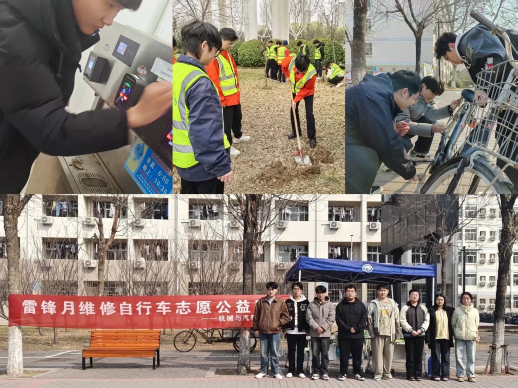 学院立足师生需求,组织多场校园志愿服务行动,把雷锋精神融入到日常学习、生活和工作中,从身边小事做起。志愿者为师生躬身检修自行车近百辆,普及保养知识,用扳手与汗水守护师生“最后一公里”的安全;全面清洁维护教学楼直饮水机,保障饮水安全,将“奉献”二字融入一拭一抹的细节;开展义务植树活动,以“植”此青绿的担当,为生态校园增添盎然生机。