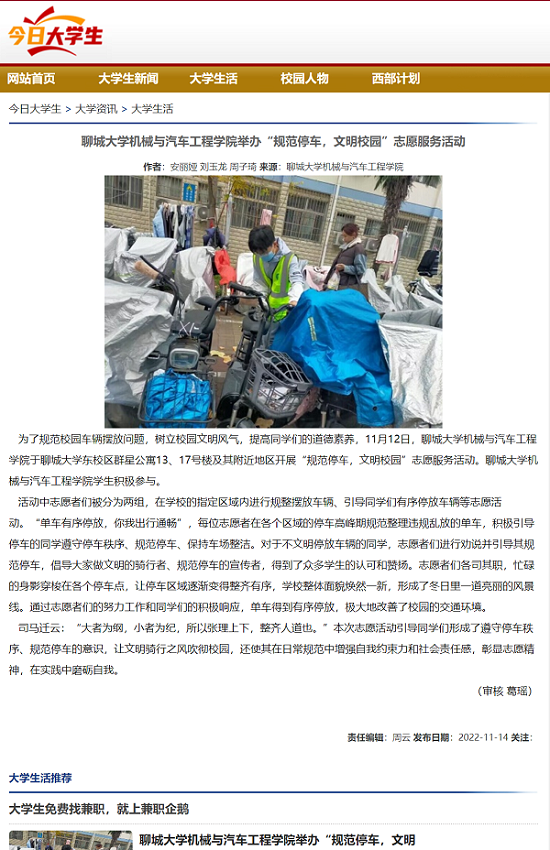 【今日大学生网】报道英国365集团举办“规范停车,文明校园”志愿服务活动