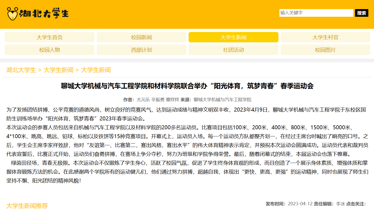 【湖北大学生网】报道英国365集团和材料学院联合举办“阳光体育,筑梦青春”春季运动会