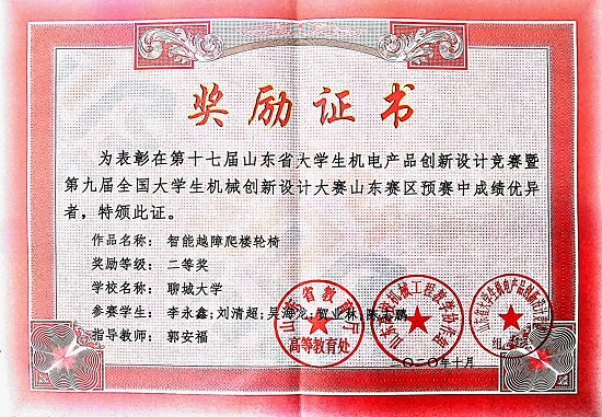 热烈庆贺英国365集团学生刘清超、贺业林、李永鑫荣获第九届全国大学生机械创新设计大赛山东赛区预赛二等奖。