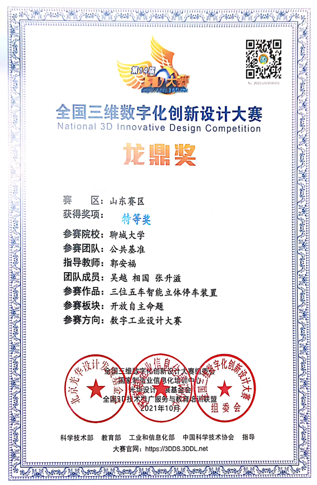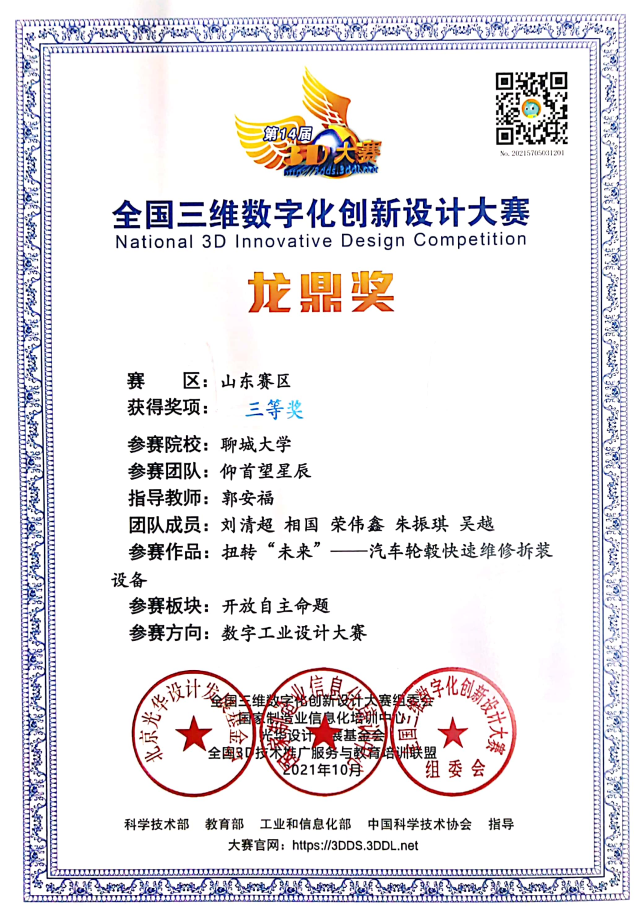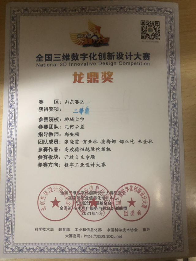 恭喜英国365集团2019级优秀学生贺业林、2020级优秀学生张晓雯、荣伟鑫、朱全林等,在全国三维数字化创新设计大赛龙鼎奖中,荣获二等奖。