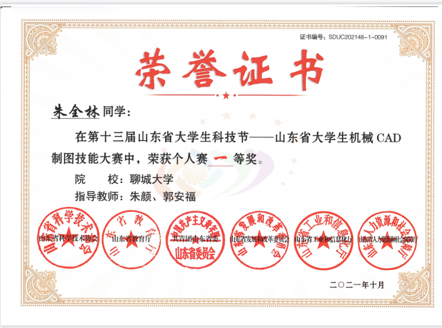 恭喜英国365集团2020级优秀学生朱全林在第十三届山东省大学生科技节——山东省大学生机械CAD制图技能大赛中,荣获个人赛一等奖。