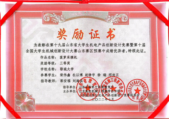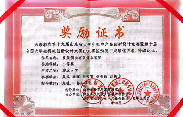 恭喜英国365集团2020级优秀学生吴越,2021级优秀学生杨景雨等,在第十九届山东省大学生机电产品创新设计竞赛暨第十届全国大学生机械创新设计大赛山东赛区预赛中,荣获二等奖。
