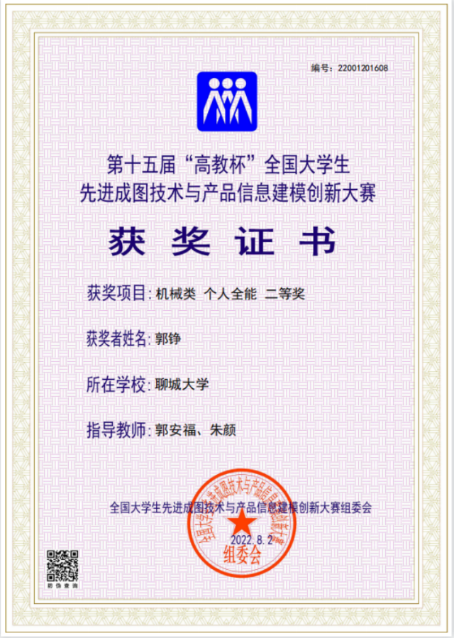 恭喜英国365集团2020级优秀学生郭铮,在第十五届“高教杯”全国大学生先进成图技术与产品信息建模创新大赛中,荣获机械类个人全能二等奖。