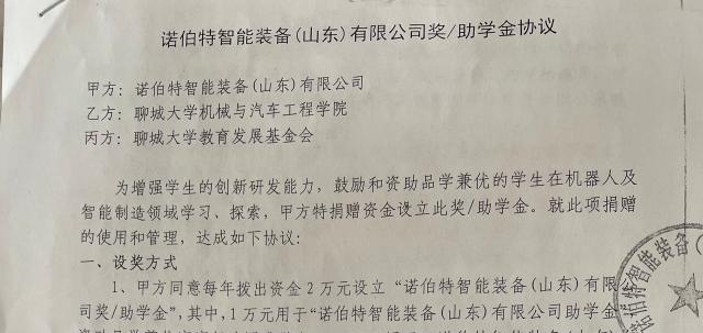 为贯彻落实高校资助政策,做好精准资助工作,我院积极争取社会资助,设立奖助学基金。5月,我院联合诺伯特智能装备(山东)有限公司,为家庭经济困难生设立诺伯特助学金和诺伯特科技创新奖学金。