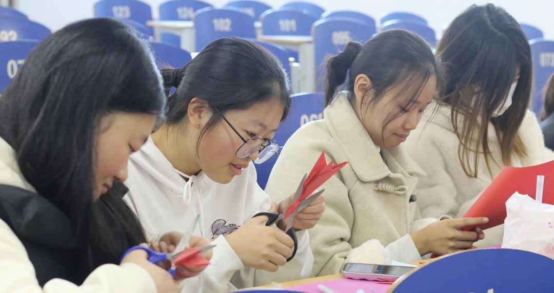 学院组织现场女生开展手工DIY剪纸活动,桌上摆满了鲜艳的彩纸和剪刀等工具,有的学生眉头紧皱,思考着剪纸的图案设计,有的则与旁边的同学交流看法。剪纸作品慢慢增多,有漂亮的雪花,有鲜艳的花朵等,师生们在创作中感受艺术魅力,相互分享自己的创作成果,同时也在传递着心里的那一份喜悦,女生们丰富的想象力、创造力得到了充分展示。同学们渐渐敞开心扉,踊跃发言,就目前感到困扰的人际关系、心理情绪和职业生涯发展规划问题向老师提出了疑问。三位老师认真聆听,现场耐心细致地解答同学们的疑问。活动最后,大家拿着自己的作品合影,师生间的情谊在这一刻被永远定格。