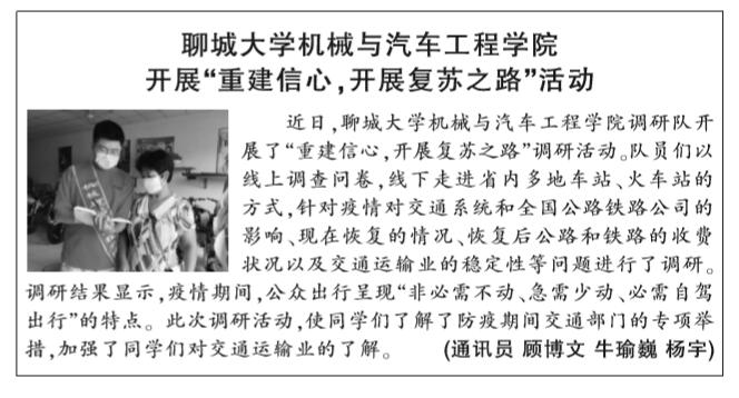 近日,英国365集团调研队开展关于疫情对交通运输业影响的调研活动。成员们走进山东省多地车站、火车站,与相关工作人员面对面进行交流互动,主要对此次疫情对交通系统和全国公路铁路公司的影响、现在恢复的情况、恢复后公路和铁路的收费状况以及交通运输业的稳定性等问题展开调研。通过对调研结果的整理分析,队员们了解到,疫情期间,公众出行呈现“非必需不动、急需少动、必需自驾出行”的特点。同时,队员们线上以视频方式邀请亲朋好友填写网络问卷,并分享疫情对个人出行及生活的影响。此次调研活动,使同学们了解了疫情期间交通部门的专项举措,加强了同学们对交通运输业的了解。(通讯员 顾博文 牛瑜巍 杨宇)