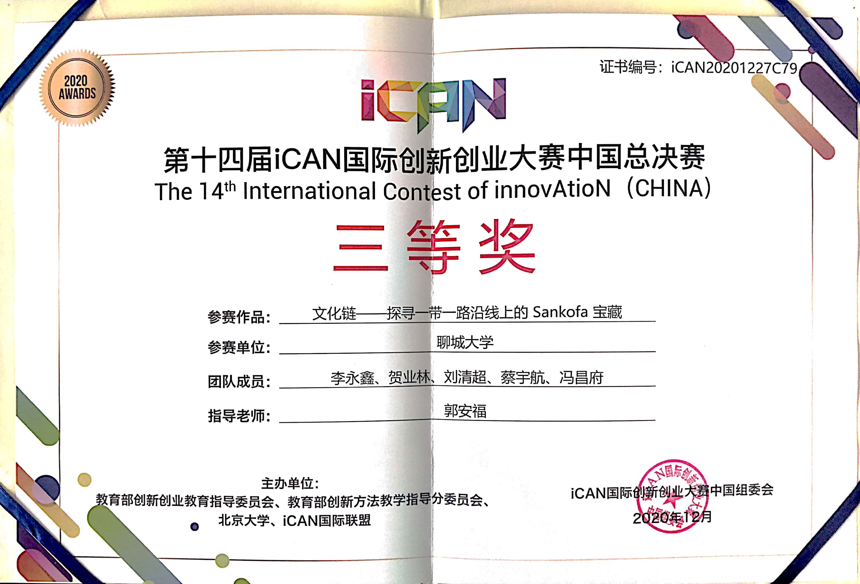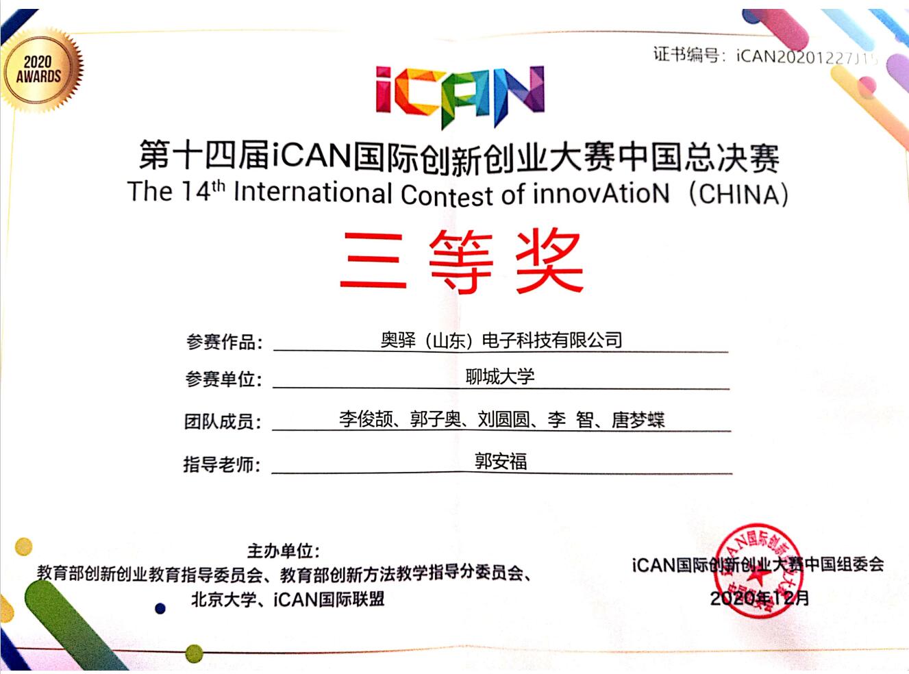 2020年12月25日-27日,由iCAN国际联盟、亚太创新学院等单位主办的第十四届iCAN国际创新创业大赛中国总决赛暨2020亚太创新学院(APIA)国际创新加速营在浙江余姚中国云城圆满举行。我院获得国赛三等奖2项,实现了我院在该项赛事中的新突破。