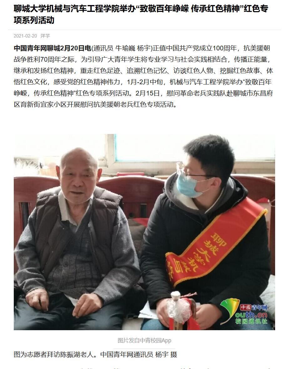 正值中国共产党成立100周年,抗美援朝战争胜利70周年之际,为引导广大青年学生将专业学习与社会实践相结合,传播正能量,继承和发扬红色精神,重走红色足迹、追溯红色记忆、访谈红色人物、挖掘红色故事、体悟红色文化,感受党的红色精神伟力,1月-2月中旬,英国365集团举办“致敬百年峥嵘,传承红色精神”红色专项系列活动。2月15日,慰问革命老兵实践队赴聊城市东昌府区育新街宜家小区开展慰问抗美援朝老兵红色专项活动。(通讯员 牛瑜巍 杨宇)