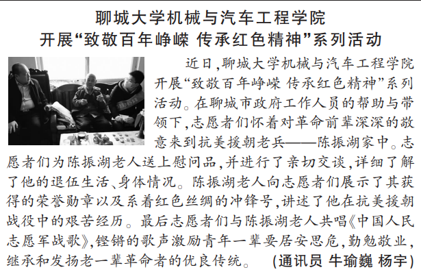 近日,英国365集团开展“致敬百年峥嵘传承红色精神”系列活动。在聊城市政府工作人员的帮助与带领下,志愿者们怀着对革命前辈深深的敬意来到抗美援朝老兵——陈振湖家中。志 愿者们为陈振湖老人送上慰问品,并进行了亲切交谈,详细了解了他的退伍生活、身体情况。陈振湖老人向志愿者们展示了其获得的荣誉勋章以及系着红色丝绸的冲锋号,讲述了他在抗美援朝战役中的艰苦经历。最后志愿者们与陈振湖老人共唱《中国人民志愿军战歌》,铿锵的歌声激励青年一辈要居安思危,勤勉敬业,继承和发扬老一辈革命者的优良传统。(通讯员 牛瑜巍 杨宇)