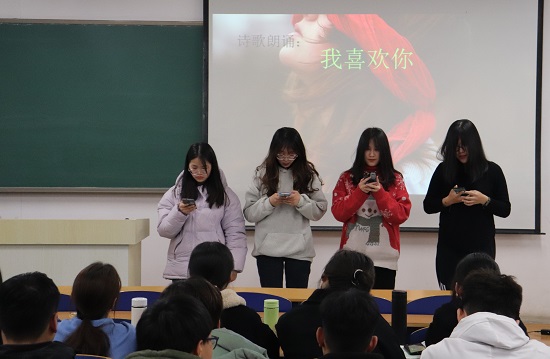 此次活动分为才艺汇演、游戏互动和传递祝福三个环节,首先,主持人宣布汇演正式开始,并代表学院同学表达对女生们节日的祝福。同学们放开自我,各自展现自己的才艺,积极地投入表演,“从前的歌谣,都在之间绕,再无激荡的波涛,也从不在梦里飘摇”“秋风落日入长河,江南烟雨行舟”一首首网络流行歌曲《踏山河》《白月光与朱砂痣》等化作点点闪烁的霓虹,点缀了星辰漫天的夜空。星空下同学们深情的朗诵诗歌,语调悠扬婉转,诗词蕴含着饱满的感情,无不表达了对女生们节日的祝福。中场休息,主持人与观众进行了击鼓传花活动,被选中的同学抽取纸条,做出纸条上的互动情节,增加了活动的趣味性,同学们之间的配合融洽,活动氛围愈加热烈。青春饱含活力的欢声笑语渐渐充盈了整间教室,欢乐的情绪感染了每一个人。随着击鼓传花的背景音乐声渐渐停止,活动即将接近尾声。在场的同学纷纷拿起早已发放的小卡纸,在上面写上内心的祝福并折成纸鹤送给在场的女生。最后,由主持人宣布汇演结束。