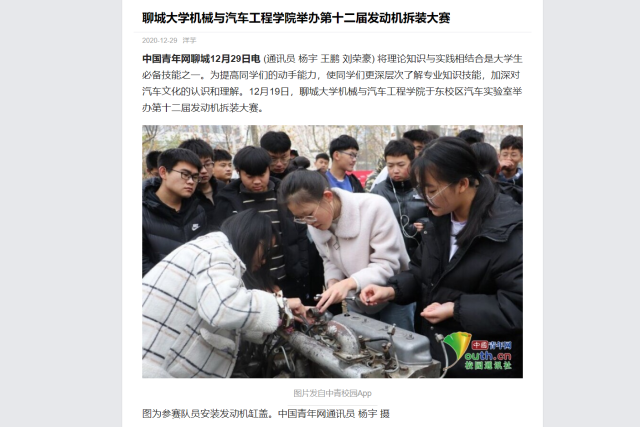 将理论知识与实践相结合是大学生必备技能之一。为提高同学们的动手能力,使同学们更深层次了解专业知识技能,加深对汽车文化的认识和理解。12月19日,英国365集团于东校区汽车实验室举办第十二届发动机拆装大赛。(通讯员 杨宇 王鹏 刘荣豪)