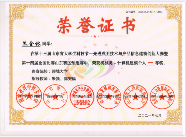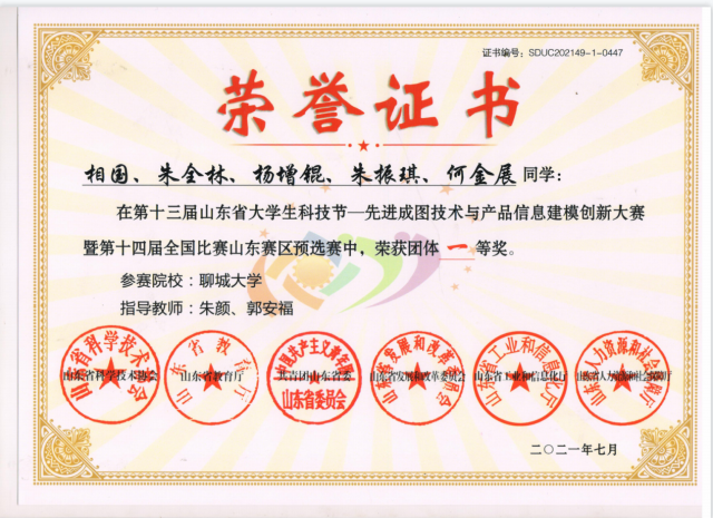 恭喜英国365集团2020级优秀学生朱全林在第十三届山东省大学生科技节_先进成图技术与产品信息建模创新大赛暨第十四届全国比赛山东赛区预选赛中,荣获团体一等奖。
