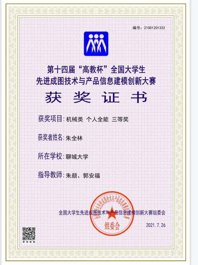 恭喜英国365集团2020级优秀学生朱全林在第十四届“高教杯”全国大学生先进成图技术与产品信息建模创新大赛中,荣获机械类个人全能三等奖。