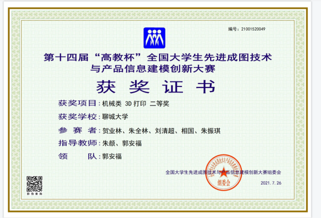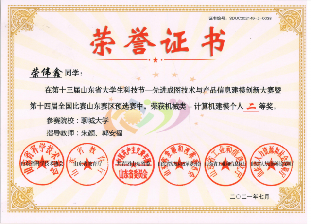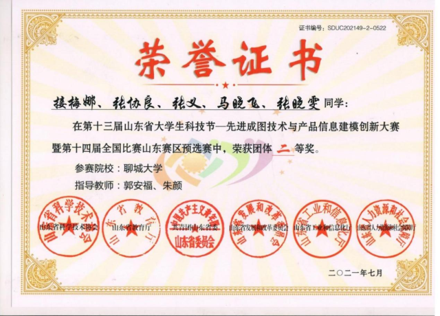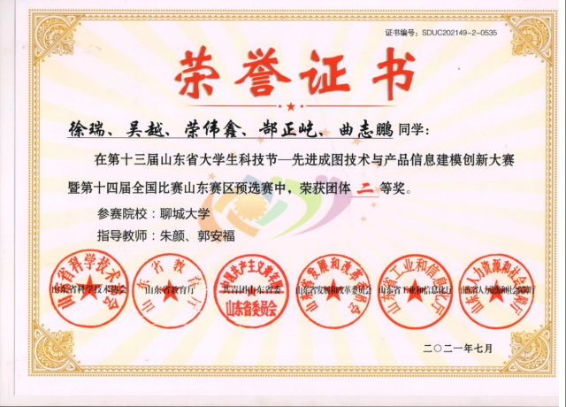恭喜英国365集团2020级优秀学生荣伟鑫,在第十三届山东省大学生科技节——先进成图技术与产品信息建模创新大赛暨第十四届全国比赛山东赛区预选赛中,荣获团体二等奖。