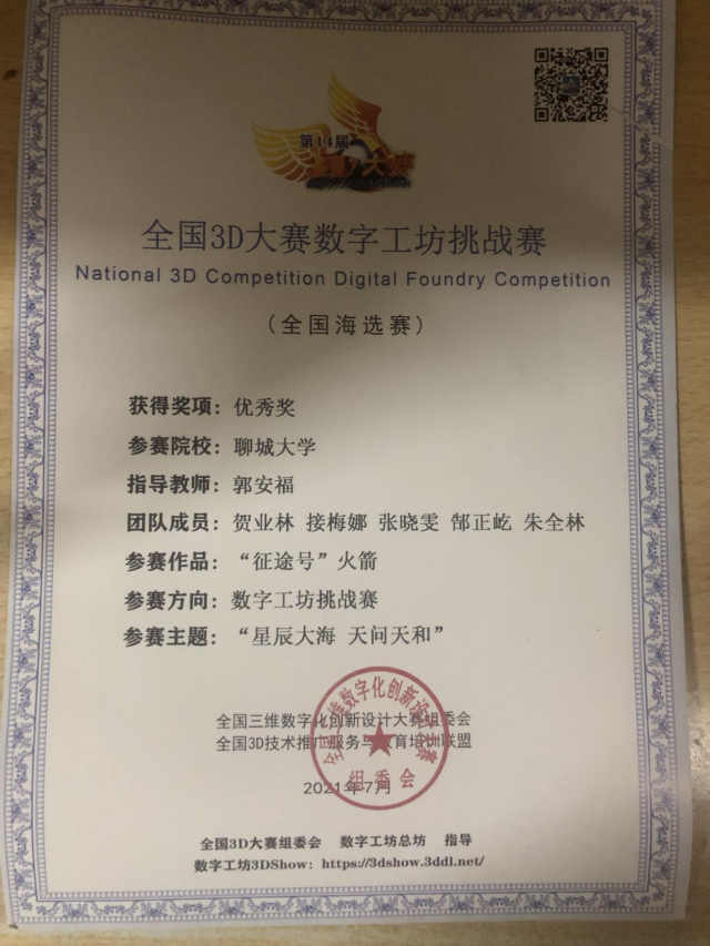 恭喜英国365集团2020级优秀学生张晓雯,在全国3D大赛数字工坊挑战赛(全国海拔赛)中,荣获优秀奖。