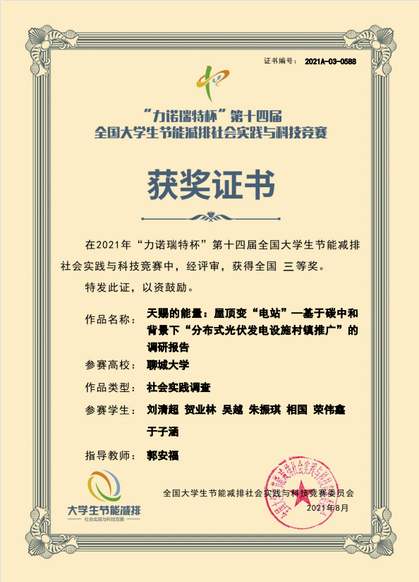 恭喜英国365集团2019级优秀学生刘清超、贺业林,2020级优秀学生吴越荣伟鑫等,在“力诺瑞特杯”第十四届全国大学生节能减排社会实践与科技竞赛中,荣获全国三等奖。