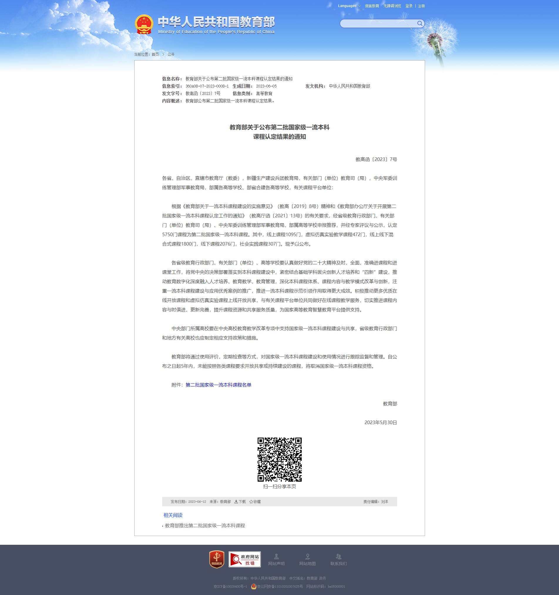 教育部近日发布了《关于公布第二批国家级一流本科课程认定结果的通知》(教高函〔2023〕7号),我院郭安福副教授教学团队申报的《机械设计》课程获批线上线下混合式一流本科课程,实现了我院国家级一流本科课程零突破。